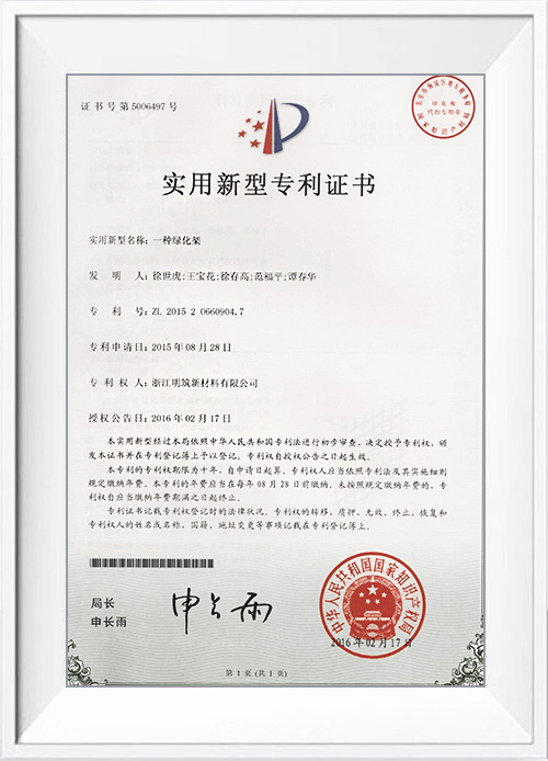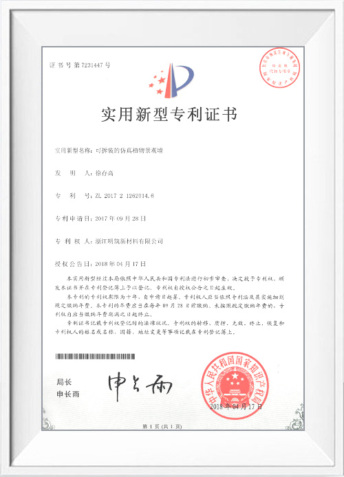 浙江明筑新材料股份有限公司坐落于浙江省風(fēng)景秀麗的5A級風(fēng)景名勝區(qū)天臺縣,是專業(yè)生產(chǎn)仿真植物墻的企業(yè),產(chǎn)品出口100多個國家,是生產(chǎn)仿真植物墻產(chǎn)品的先驅(qū)企業(yè),廠區(qū)現(xiàn)有建筑面積13萬平方米。公司建立的ISO9001國際質(zhì)量管理體系、ISO14001環(huán)境管理體系標(biāo)示著明筑產(chǎn)品的優(yōu)良品質(zhì);明筑擁有優(yōu)秀的技術(shù)研發(fā)能力先后獲得的歐美多個國家七十多項專利,公司自主研發(fā)多條生產(chǎn)線設(shè)備。榮獲國家高新技術(shù)企業(yè)、浙江省名牌產(chǎn)品、浙江省出口名牌企業(yè)、浙江省知名商號、浙江省誠信企業(yè)、浙江省信用管理示范企業(yè)、浙江省科技型企業(yè)、浙江省成長型企業(yè)和臺州市級的專利示范企業(yè)、與企業(yè)技術(shù)中心等榮譽(yù)稱號。