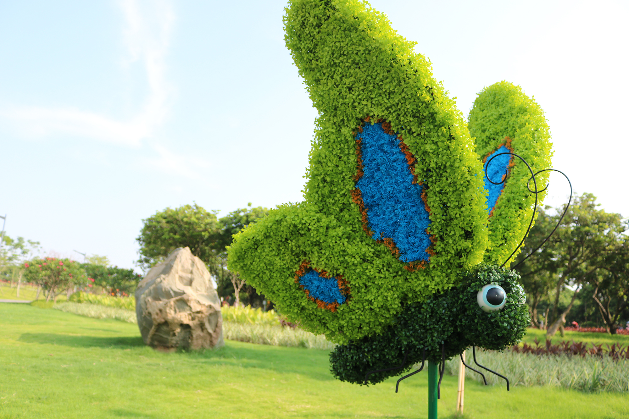 植物雕塑以其充分的藝術(shù)表現(xiàn)力,與環(huán)境優(yōu)秀的兼容性成為園林綠化的寵兒,真植物雕塑是以繁瑣,復(fù)雜的修剪為主,通常需要數(shù)年才能完成,后期需要長時(shí)間的維護(hù),施肥除蟲修剪,遇到極端天氣容易損毀。而仿真綠植雕塑制作流程大幅簡短,短時(shí)間內(nèi)就可建立模型,在模型的基礎(chǔ)上裝飾仿真綠植而成,仿真綠雕選擇性更廣,顏色豐富,材質(zhì)柔軟易用于各類復(fù)雜造型,形態(tài)相比真植物不逞多讓,使用年限更久,維護(hù)成本極低。