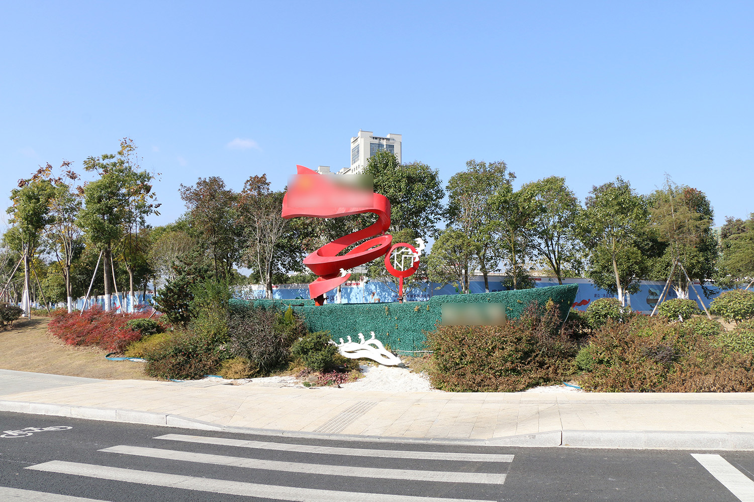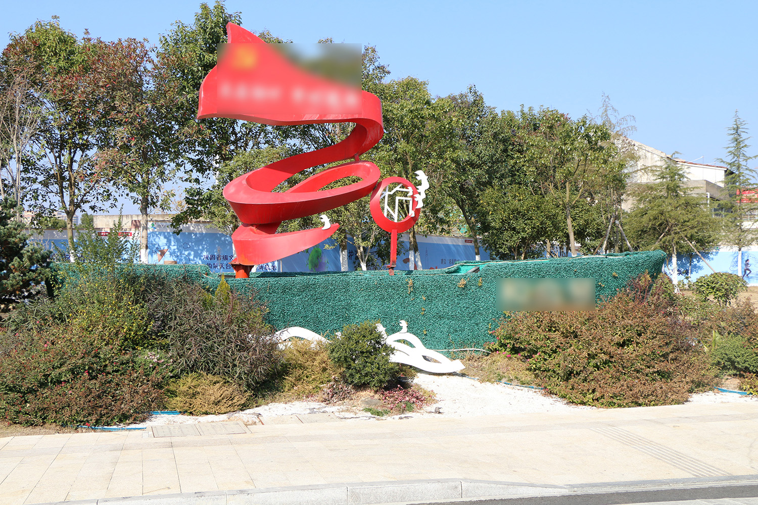 走近后觀看雕塑的底部為仿真植物米蘭葉的船身, 原本應(yīng)該墨綠色的葉片,經(jīng)過(guò)太陽(yáng)曝曬已經(jīng)褪色嚴(yán)重,失去了光彩,對(duì)于其黨建宣傳的形象也是大打折扣。